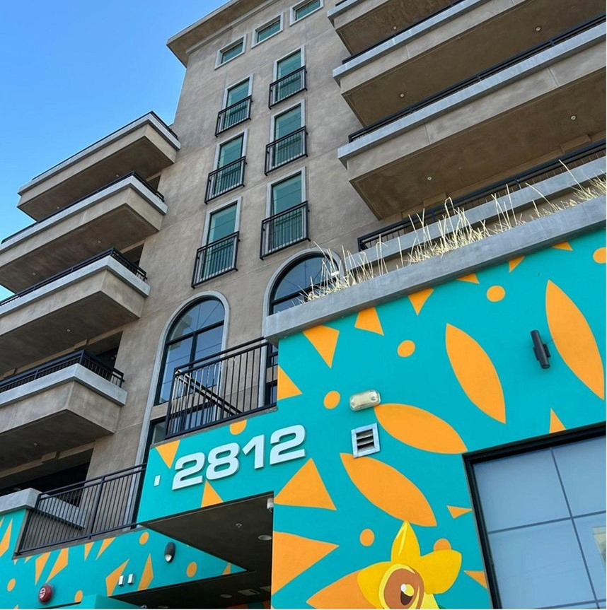 Temple provides 41 permanent supportive homes and one manager unit, with 15 units reserved for chronically homeless residents. The building underwent extensive retrofitting to ensure accessibility and features a custom mural by local artist Hedy Torres.